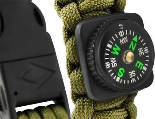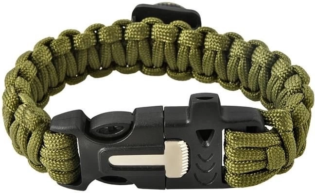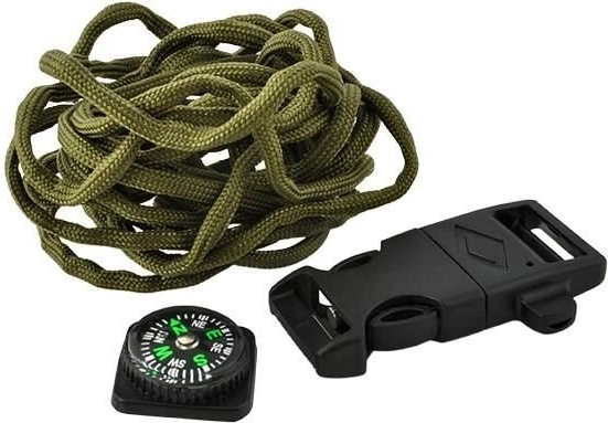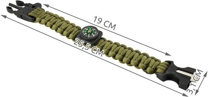 - 5 functies in één: paracord koord, mes, vuurstarter, kompas en fluitje.