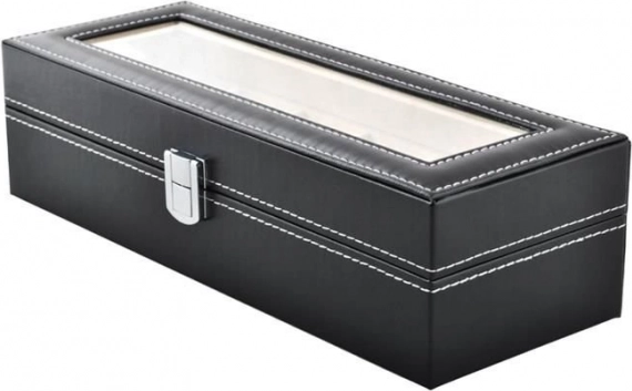 Het model heeft een stijlvolle zwarte design met contrasterende naden, wat de hele doos een vleugje elegantie en luxe geeft. Het glazen deksel zorgt ervoor dat uw horloges niet alleen bescherming krijgen, maar ook op een elegante manier tentoongesteld worden.