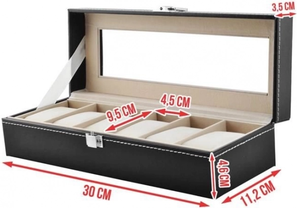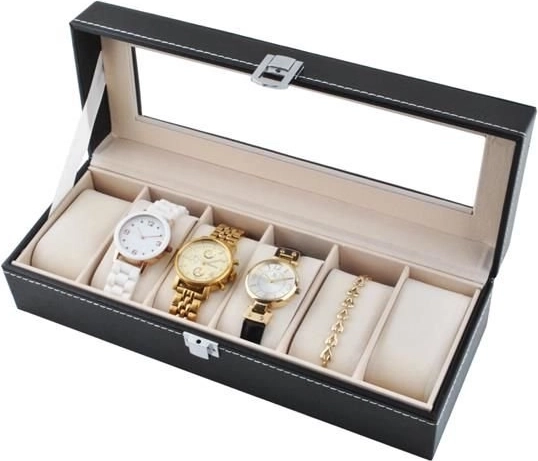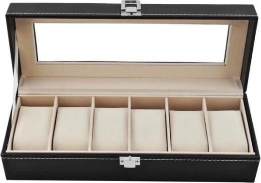 Wij presenteren u een elegante horloge-organizer met maar liefst 6 aparte vakken. Deze organizer is niet alleen bedoeld voor horloges, maar u kunt er ook veilig andere sieraden in opbergen dankzij het zachte materiaal aan de binnenkant, dat beschermt tegen krassen.