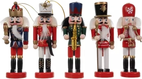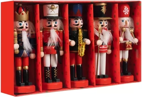 Houten notenkrakers in deze set van vijf stuks vormen een prachtige toevoeging aan uw kerstdecoratie. Gemaakt van hoogwaardig hout, garanderen ze een lange levensduur en brengen ze traditionele kerstsfeer in huis.