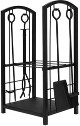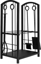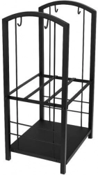 De praktische houtstandaard met accessoires maakt het mogelijk om hout direct bij de haard op te slaan en alles wat je nodig hebt binnen handbereik te houden. Twee opbergniveaus bieden ruimte voor hout en kleine benodigdheden; de dichte onderste plank voorkomt bovendien dat splinters en vuil doorvallen. De matzwarte uitvoering van roestvrij staal maskeert kleine krassen en vuil en oogt tijdloos.