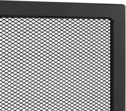 Het fijne stalen gaas vangt vonken en vuil op; de matte zwarte afwerking camoufleert kleine krasjes en zorgt voor een elegante uitstraling.