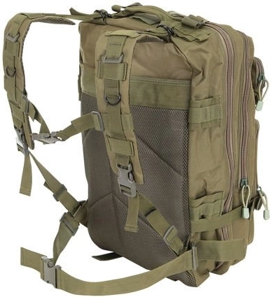 De rugzak is uitgerust met PALS-banden voor het MOLLE-systeem om extra uitrusting te bevestigen. Volledige verstelling maakt het mogelijk de omvang van de rugzak aan te passen met verstelbare banden, geschikt voor het dragen van bijvoorbeeld een slaapmat of tent.
