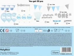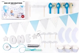 - Banner “One” (1 st.), papieren slinger (1 st.), cupcakeversieringen (6 st.), blauwe cupcakewikkels (6 st.), caketopper (1 st.), rietjes (10 st.), ballonnen – mix van designs (6 st.), zilveren serpentines (1 st.), lichtblauw satijnen lint (breedte 6 mm, 1 st.)