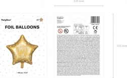 Stijlvolle folieballon in de vorm van een ster in een elegante gouden kleur met de witte opdruk Happy Birthday. Ideaal voor een verjaardagsfeest, geschikt om met helium of lucht te vullen en een perfecte aanvulling op de decoratie dankzij het glanzende oppervlak en het compacte formaat van 40 cm na het opblazen.