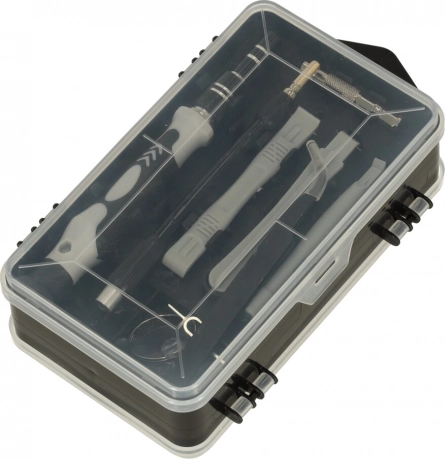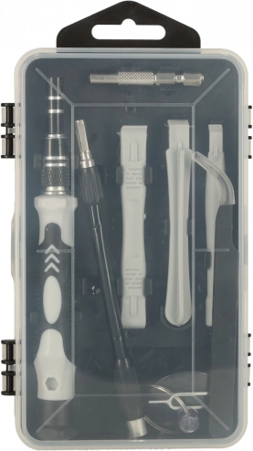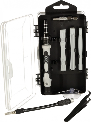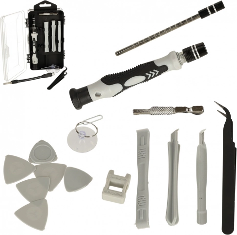 - Schroevendraaier met handgreep, adapter, flexibele verlenging, kunststof openers, pincet, zuignap voor glas, simnaald, magnetiseerder/demagnetiseerder, dubbelzijdige etui