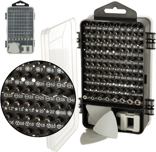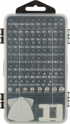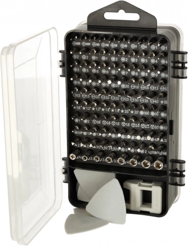 In de set zitten 96 verschillende bits (Torx, Torx met gat, inbus/Hex, sleuf, Phillips, PZ, Square, driehoek, pentalobe, microstix, dopsleutels en meer), een flexibele verlengstuk voor lastig bereikbare plekken, openingshulpen, een zuignap, pincet en een magnetiseerder/demagnetiseerder voor beter vasthouden van schroefjes. De dubbelzijdige etui met gelabelde posities zorgt voor overzichtelijke opslag en snel terugvinden van het juiste onderdeel.