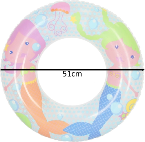 De BESTWAY-opblaasbare zwemband voor kinderen met een diameter van 51 cm en een speels zeemeerminnenmotief is ideaal voor de eerste waterpret. Biedt veilige drijfondersteuning, is licht, snel op te blazen en eenvoudig in te pakken voor op vakantie.