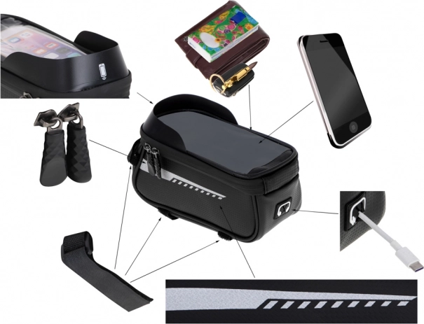 De hele tas is stevig en stabiel, gemaakt van hoogwaardig waterdicht materiaal, ideaal voor fietstochten in de regen. Het hoofdvak dient als een praktische opslagruimte voor sleutels, portemonnee, documenten, powerbank, bril of zakdoekjes. Bovendien is er een uitgang voor oortjes die elke rit aangenamer maakt.