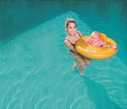 Het opblaasbare kinderzitje voor in het water is de perfecte hulp voor ouders die hun kinderen al op jonge leeftijd met water willen laten kennismaken. Geschikt voor gebruik in zwembaden, maar ook aan zee of op een meer. De ronde vorm zorgt voor goede drijfkracht en stabiliteit, wat het kind helpt het evenwicht te bewaren en veilig op het wateroppervlak te drijven. Voor extra comfort en veiligheid is het zitje voorzien van geïntegreerde “broekjes” die het kind ondersteunen en omkantelen voorkomen. De vrolijke, levendige kleuren met een krabmotief trekken de aandacht van kinderen en nodigen uit tot waterpret.