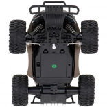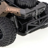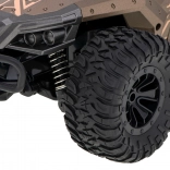 De auto is uitgerust met grote rubberen banden met profiel en een robuust chassis voor het overwinnen van uitdagend terrein.