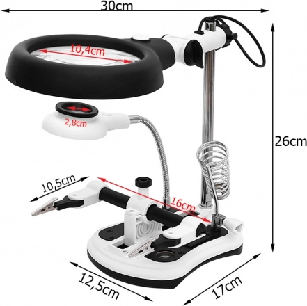 Multifunctionele loep met derde-hand houder voor nauwkeurig solderen en repareren. Biedt 2,5x/5x/6x/10x vergroting, 12 + 6 LED's met twee lichtstanden en een stabiele basis met organizers. Dankzij de verstelbare armen, krokodilklemmen en soldeerbouthouder ideaal voor elektronica, horlogemakerij en fijn modelbouwwerk.