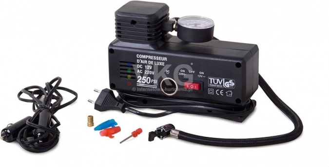 Compressor, 12 V-kabel voor sigarettenaansteker, 230 V-voedingskabel, manometer, set adapters, originele verpakking
