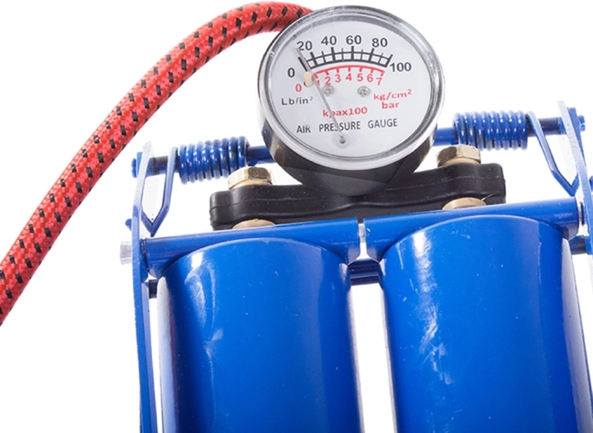 Voetpomp met dubbele cilinder, manometer en adapters. Snel oppompen, druk 100 PSI/7 bar, rubberen pedaal, vergrendeling voor opslag. Ideaal voor auto, fiets en ballen.