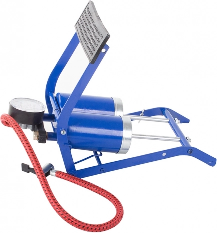 Compacte en betrouwbare voetpomp met een dubbele cilinder voor snel en comfortabel oppompen van banden van auto’s, motoren en fietsen, evenals ballen en matrassen. Biedt een maximale druk van 100 PSI / 7 bar, een duidelijke manometer, een duurzame constructie en een antislip rubberen pedaal voor veilig gebruik. Een praktische vergrendeling tegen onbedoeld openen zorgt voor eenvoudig dragen en opbergen.