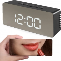 De stijlvolle LED wekker combineert praktische functies met een modern uiterlijk. Het spiegeloppervlak van het display is handig voor een snelle lookcheck, de helderheid is instelbaar zodat de wekker ’s nachts niet stoort en overdag perfect leesbaar is. Het overzichtelijke LCD toont de tijd in 12/24 u-formaat, de datum en de temperatuur in °C of °F.