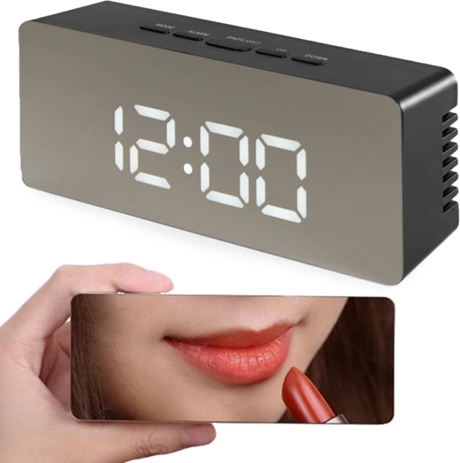 Multifunctionele LED wekker 4-in-1 toont tijd, datum en temperatuur, biedt een wekker met snooze en heeft een spiegeldisplay met witte achtergrondverlichting. Dankzij het elegante design past hij perfect in de slaapkamer, kantoor en kinderkamer.