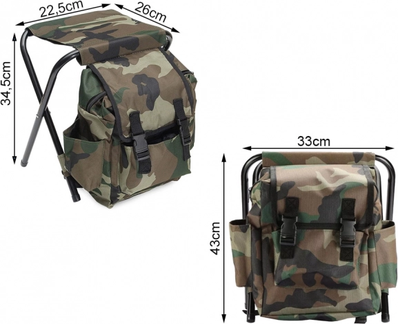 Praktische opvouwbare stoel met geïntegreerde rugzak, ideaal voor vissen, kamperen, strand en tuin. Biedt comfortabele en stabiele zit, een stevig stalen frame en een ruime tas onder de zitting met vakken voor drankjes en kleine spullen. Ingevouwen neemt hij minimale ruimte in en dankzij de schouderbanden draag je hem comfortabel op de rug.