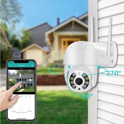 De buitenshuis WiFi-camera is voorzien van opnamehoeken tot 270 graden horizontaal en 90 graden verticaal, wat zorgt voor een breed dekkingsgebied. Dankzij de nachtmodus met infrarood- en LED-lampen zijn de beelden ook bij volledige duisternis gedetailleerd.