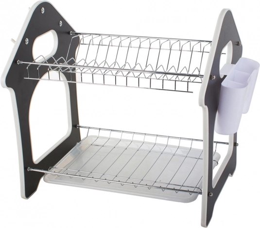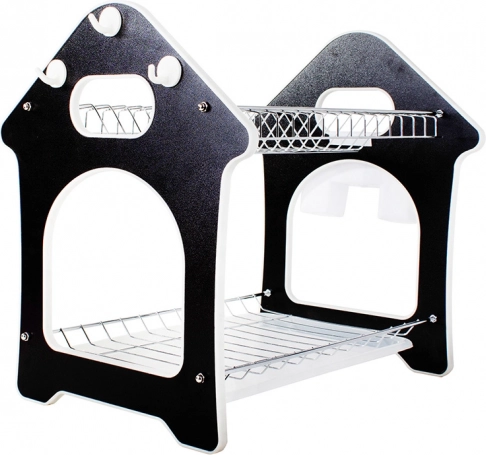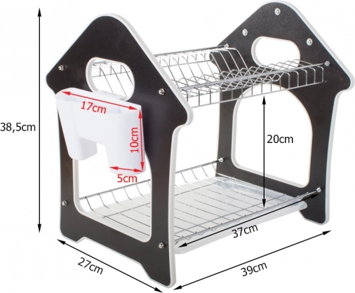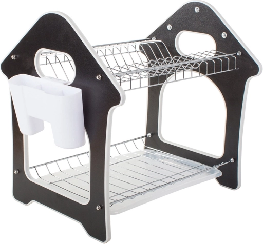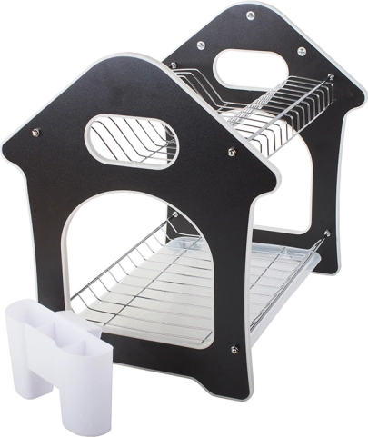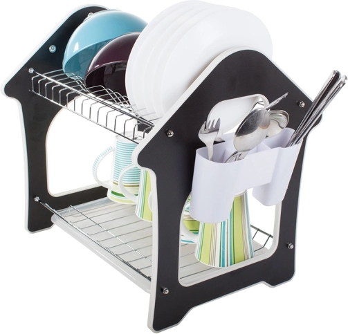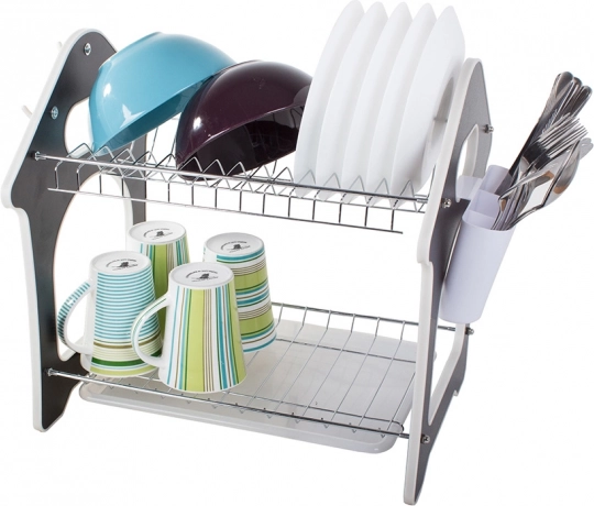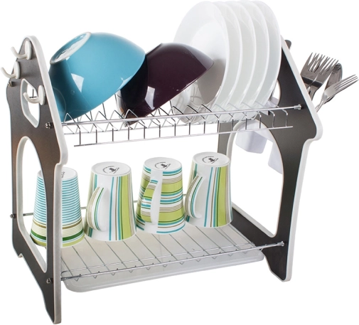 Dit tweelaagse afdruiprek benut de verticale ruimte optimaal en biedt plaats aan tot 14 borden op de bovenste plank, terwijl de onderste plank ideaal is voor kommen, mokken en glazen. Inclusief een afneembare bestekhouder die aan elke zijde geplaatst kan worden en drie haken voor het ophangen van keukengerei.