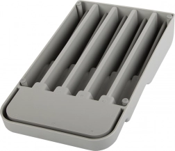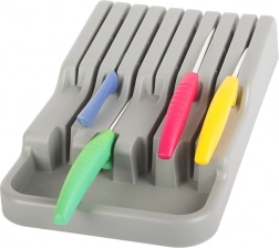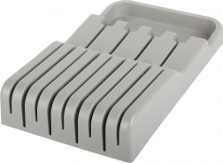 De messenhouder voor in de lade is een uitstekende keuze voor zowel moderne als traditionele keukens. Gemaakt van duurzaam plastic in een elegante grijze kleur, wat zorgt voor een lange levensduur. Dankzij de compacte afmetingen past hij gemakkelijk in elke standaard keukenlade, waardoor de ruimte optimaal wordt benut.