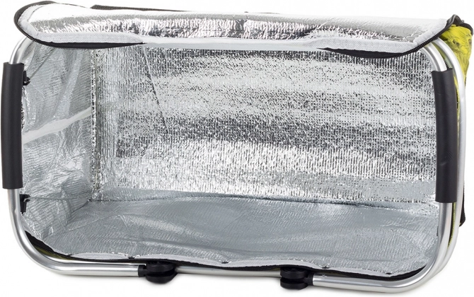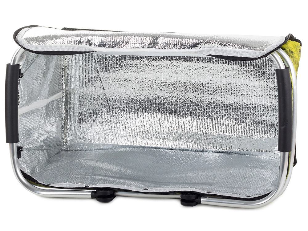 Praktische en stijlvolle thermomand voor picknicks, strand en boodschappen, die dankzij de interne thermofolie betrouwbaar eten en drinken op de gewenste temperatuur houdt. Heeft een lichtgewicht aluminium frame, een ritssluiting, opvouwbare handgrepen met antislipafwerking en een verstevigde, gewatteerde bodem voor stabiliteit. In opgevouwen toestand neemt hij minimaal ruimte in.
