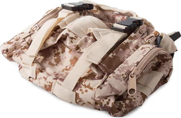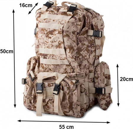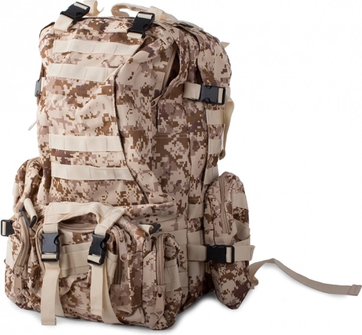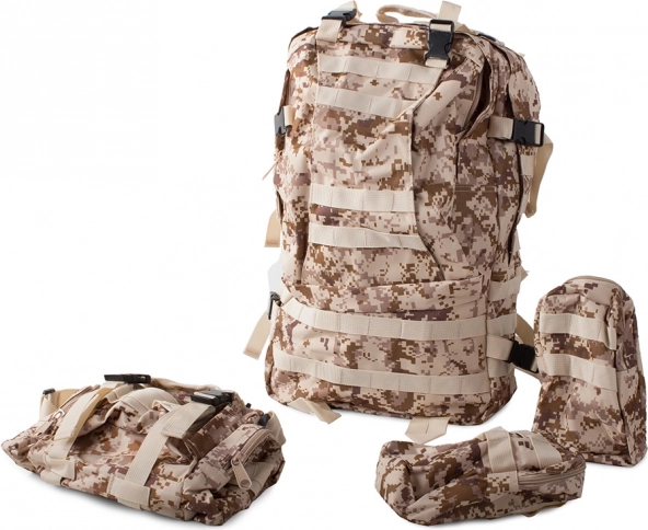 Ga op pad zonder je zorgen te maken over het weer met de waterdichte tactische rugzak. Deze rugzak biedt één groot hoofdvak met een extra compartiment en meshzakken voor betere organisatie. Twee zijtassen kunnen eenvoudig afgenomen worden, terwijl de grotere heuptas als aparte tas kan worden gebruikt. De rugzak maakt gebruik van het MOLLE-systeem voor het toevoegen van extra zakken en modules en is uitgerust met een borst- en heupband voor maximaal comfort en stabiliteit.