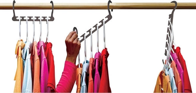 Praktische kastorganizer voor hangers waarmee u snel uw kleding ordent en aanzienlijk ruimte in de kast bespaart. Nieuw, steviger model van duurzamere materialen, geschikt om tot 5 hangers per paneel op te hangen en zowel horizontaal als verticaal te gebruiken.