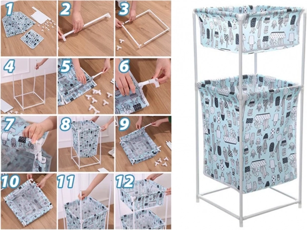 De wasmand is ontworpen voor maximale functionaliteit en gebruiksgemak. Dankzij zijn universele constructie kan hij op twee verschillende manieren worden gebruikt: met de bovenste plank of als één grote mand. Hij is gemaakt van hoogwaardig plastic en waterbestendige stof, wat zorgt voor een lange levensduur en gemakkelijk onderhoud.