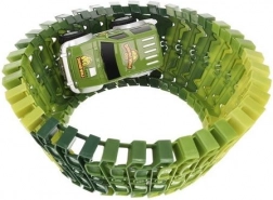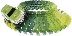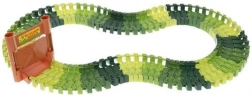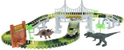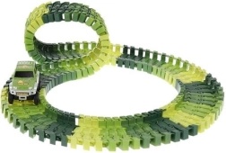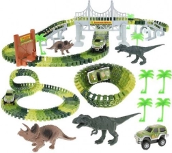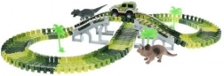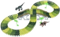 Ontdek plezier in prehistorische stijl! Deze dinosaur racebaan biedt maar liefst 153 delen, waaronder elastische rails in 4 groentinten, een brug, een poort, 2 hellingen, 4 boompjes, 2 dinosaurussen en een terreinwagentje op AA-batterij. Dankzij de flexibele constructie kun je de baan vrij heropbouwen, lussen, spiralen en tunnels maken en genieten van hoge snelheid met uitstekende grip – net als in een echt dinosauruspark.