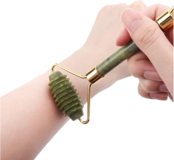 De jaderoller is een geliefd hulpmiddel voor thuisverzorging van de huid. Regelmatige massage ondersteunt de lymfedrainage, verbetert de doorbloeding en geeft de huid een gezonde glans. De grotere roller is ideaal voor voorhoofd, wangen, kin en nek; het kleinere deel is fijn rondom de ogen, neus en mond. Voor een extra verfrissend effect kunt u de roller kort in de koelkast koelen voor gebruik.