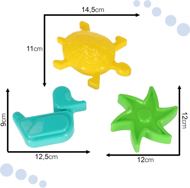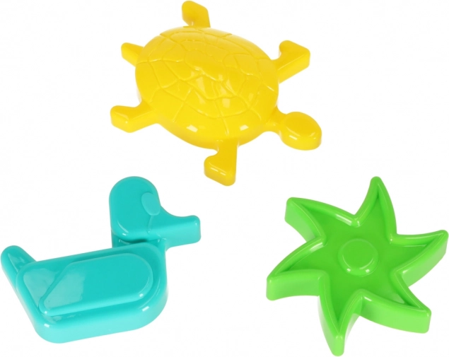 Kleurige zandset met een kunststof bootset en drie vormpjes in de vorm van een ster, eendje en schildpad. De boot kan in drie delen worden uit elkaar gehaald, dient als groot vormpje en als drijvend speelgoed voor in het water. Duurzaam plastic, ideaal voor in de zandbak, op het strand en in het bad.